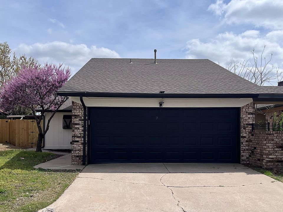 Totally remodeled two bed two bath triplex. New vinyl flooring, paint, remodeled bathrooms and kitchen with granite. Lots of natural light. Large living room with cathedral ceiling, fireplace and two sets of French doors leading to covered side patio. Spacious master with walk in closet and newly remodeled bath with double vanity. Full bathroom next to the second bedroom. Kitchen with stainless appliances and bar open to living room. Double car garage with storm shelter and washer and dryer hookups. Fenced back yard with spacious shed. Quiet neighborhood. No smoking allowed. Pet fee $300 required.