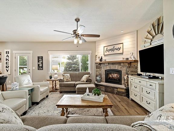 Step into this stunning single-level home that is ideally situated on a large corner lot and offers a perfect blend of comfort and style! This open, split floor plan features three bedrooms plus a den and two bathrooms. The gourmet kitchen is a chef's dream, upgraded with KitchenAid appliances, a wall oven with microwave combination, an apron front gas range, under-cabinet lighting, and quartz countertops. For cozy evenings, relax by the gas fireplace, which has been upgraded and accented w/ beautiful stone and brick. Storage is abundant including a spacious pantry, hallway closets, and a laundry room equipped with custom bench and cabinets. Step outside into the gorgeous, landscaped backyard, a tranquil oasis featuring mature trees, lush shrubbery, & a large garden. The outdoor space is perfect for entertaining w/ an extended covered patio, cafe lights, & an additional gazebo paver patio for extra seating. Let's not forget the shed, & RV parking! Pool in the community too! Close to shopping, parks & schools!