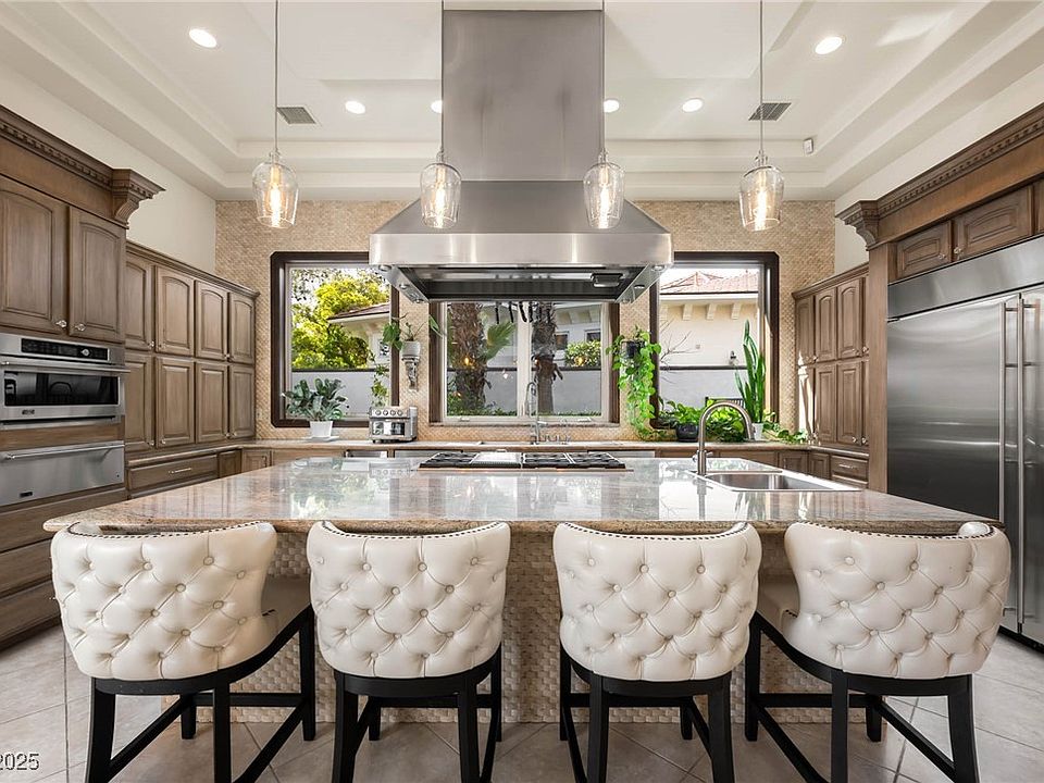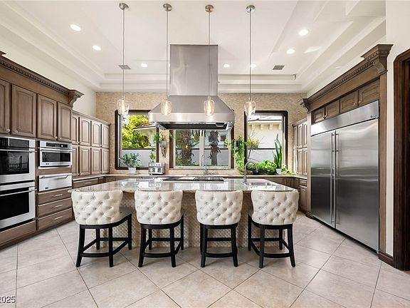Experience luxury living in the guard-gated Canyon Fairways of Summerlin. This elegant home lives like a single story, with all daily essentials on the main floor. Enjoy a state-of-the-art theater with LED lighting, premium AV, and surround sound. The expansive four-car garage features fresh epoxy floors, storage, and space for oversized vehicles. Relax in the lush courtyard or oasis-style backyard with pool, spa, and connecting stream. Entertain under the covered patio or in the gourmet kitchen with stainless appliances, walk-in pantry, breakfast bar, and spacious island. The double-sided bar links the living room and kitchen for seamless entertaining. The private master retreat offers powered drapes, security shutters, deluxe dressing room, courtyard access, and a spa-like bath with tub and steam shower. Give us a call to setup an exclusive showing.