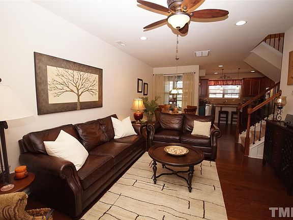 Better come quick! Stylish, Nearly New 3BR TH w. 1 car Garage in desirable Brier Creek. Hardwoods, neutral paints, modern lighting/fixtures. Living Rm w. corner fireplace. Granite Kitchen has large island w. barstool overhang, SS appliances & 42" cabs. Relax w. your morning coffee & a good book on the Screened Porch. Rare custom Patio w. stone accents! Wrought iron spindled stairs lead you up to Master Suite w. spa-like Bath, plus 2 BRs. All BRs have walk-in closets. Walking distance to shopping/dining!