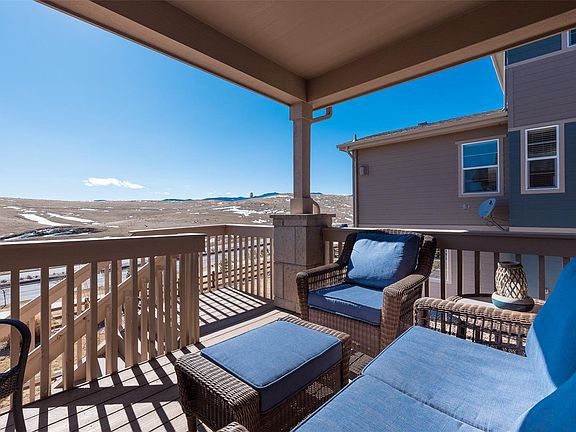 Immaculate Two-story style home in desirable Candelas neighborhood. This open floor layout is perfect for entertaining. The kitchen has a large island, stainless steel appliances, and is open to the breakfast or dining area. Just off the kitchen is a pocket office, and a convenient owner's entry, leading to the 2-car garage. Enjoy the sunsets and stunning views from the covered deck/balcony. The Study/Den located on the main level and is perfect for a home office, craft room or flex space. With 3 bedrooms total on the upper level, the spacious Master bedroom suite includes a dual sink vanity and walk-in closet. Convenient Laundry room with built-in shelves is also located on the upper level. And don't forget the walkout basement with plenty of extra storage that opens to a large backyard with brick patio and custom landscaping. Perfect for enjoying nice evenings and grilling outside.