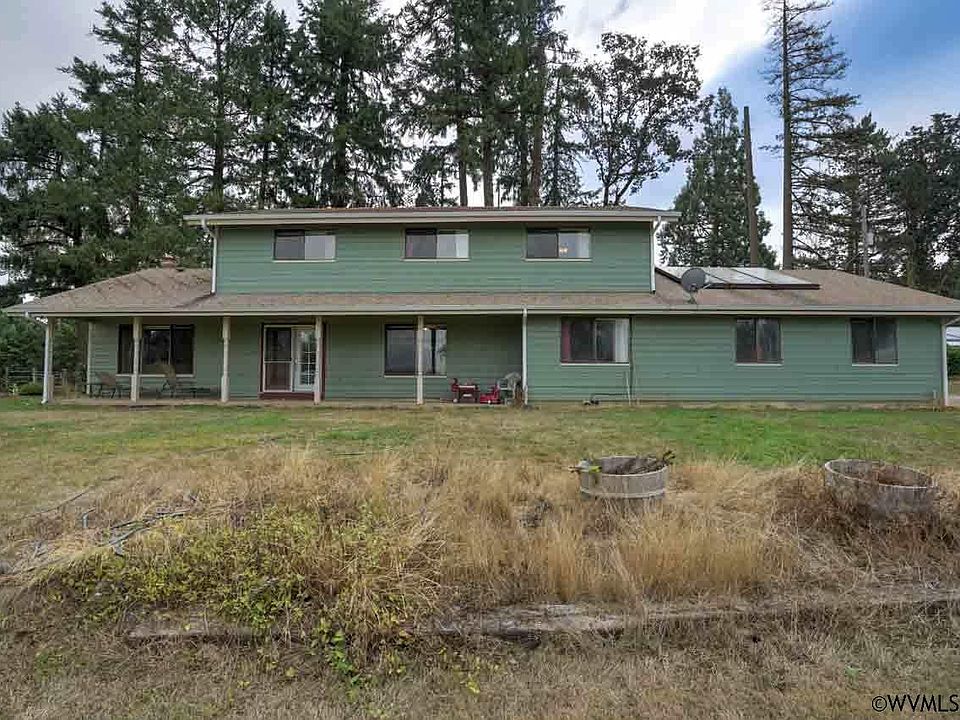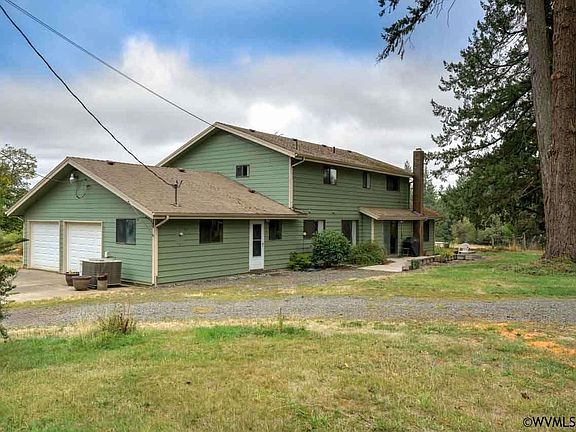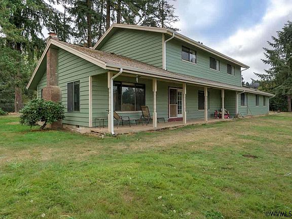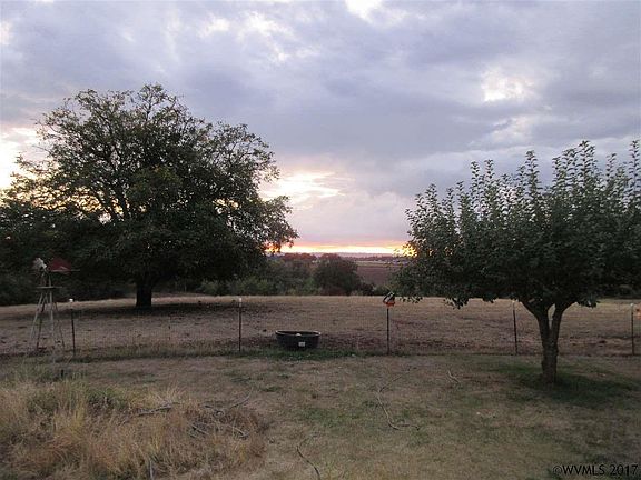 Accepted Offer with Contingencies. Sunset views across the Willamette Valley from this 2 story home. Secluded & private setting but, only minutes from Salem. Good horse property yet, currently used for cattle. Home has updated flooring / carpet and interior painting recently completed. Seasonal creek runs by the original old cabin located in 9 wooded acres of fir and oak. Pasture is fenced. 60x180 arena barn with 56x84 arena and 10 matted stalls with feed and tack room. Check out the drone video over and around the property.