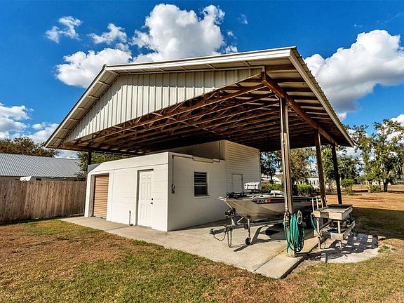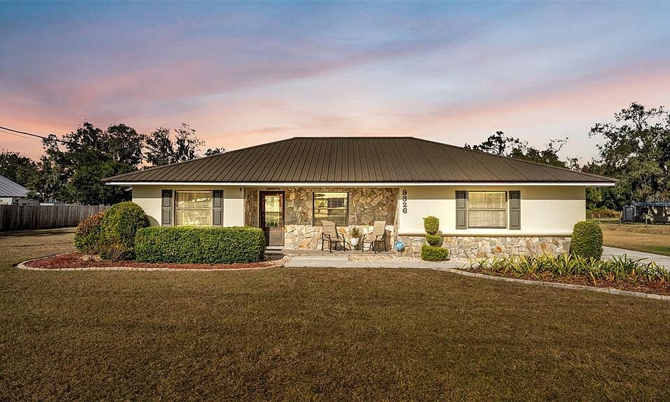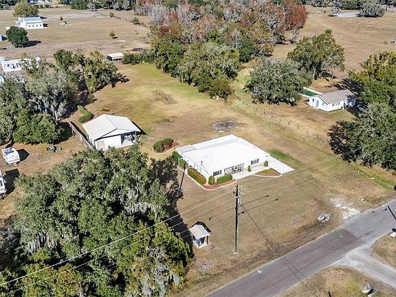 This incredible 1.75-acre property offers a charming homestead-style living experience. It features a beautifully maintained 3-bedroom home and a separate workshop. Imagine how wonderful each day would be in this peaceful country setting, with the freedom to make it all your own! The front porch, adorned with stone details and surrounded by crisp landscaping, creates a welcoming first impression. Inside, the pride of ownership is evident in the solid flooring, crown molding, attractive paint colors, and numerous updates throughout the home. The impressive kitchen seamlessly blends functionality with style. Upgraded wood cabinetry provides ample storage, while granite countertops, backsplash, and an eat-in dinette nook (complete with table and seating that remain with the home!) add to its appeal. Don’t miss the hidden island in the bar area, perfect for baking, serving, and more. The adjacent laundry room offers overflow storage, complete with a washer and dryer, and a side-entry exterior door. The large living area provides ample seating, a pass-through to the kitchen, and access to the back porch. The primary suite boasts a spacious bedroom, a generous walk-in closet with shelving, and a tastefully updated en-suite bathroom featuring quartz countertops and a tiled shower. Two additional bedrooms, each with built-in closet storage, and another nicely updated bathroom complete this split-floor-plan home. Step outside to discover an oversized 38x12 covered and screened back porch, a comfortable space to enjoy the outdoors year-round. Here you can sit back, relax, and take in the breathtaking views and sounds of nature that surround you. The backyard offers endless possibilities for gardeners and animal lovers alike. For anyone who enjoys entertaining and fun, the covered open space is great for grilling during cookouts or a play area. If you need a workshop space or an area to store a boat, camper, or other toys, the large, detached 34x32 workshop with carport and separate storage spaces offers all of this, plus water, electric and fantastic storage. This move-in-ready home has a metal roof and is in immaculate condition, but the expansive lot and serene setting are what truly make it a one-of-a-kind opportunity to escape the hustle and bustle, while still enjoying a convenient location within the Sunshine State! **THIS HOME IS LOCATED IN A USDA ELIGIBLE AREA**