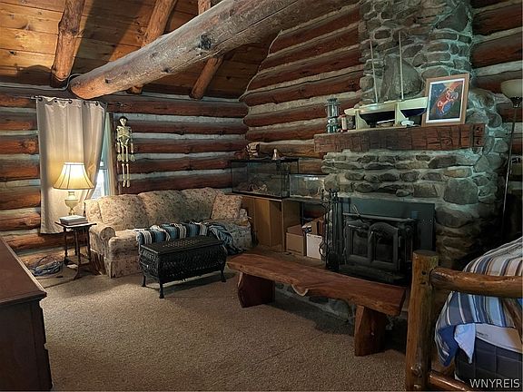 Secluded seasonal or year-round log on a quiet road, this creek side cabin has an enclosed porch and three heating sources. The cathedral ceiling in a great room opens up to the loft above, 10 wooded acres with stocked spring fed pond (bass & grass carp) with dock & 8x12, storage shed. Cabin has walkout basement with pellet furnace. Gravity fed spring water with UV filtration system, many updates were done, new double pane windows & frames 2016, roof 2016, open side deck 2016, drainage work 2017, new water pressure tank 2018, new water pump 2020, includes all appliances. All offers are due by August 1,2022 by 6pm