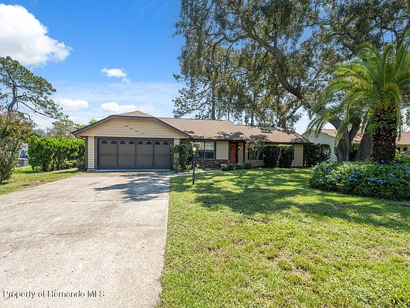 Step inside this charming two-bedroom, two-bath home with a two-car garage and feel instantly welcomed by its thoughtful layout and inviting character, from the covered entry framed by mature trees and landscaped yard that evoke an Old Florida feel, to the foyer with its handy coat closet leading into a spacious living and dining room combination accented by bay windows that bathe the space in natural light. The split plan design offers privacy, with vinyl floors throughout most of the home and a dining area that flows seamlessly to a bright kitchen featuring granite counters, real wood cabinets, white appliances, closet pantry, tiled floors, and a cozy breakfast nook surrounded by bay windows. Just beyond, a versatile family room provides an additional gathering space and opens through a wall of sliding glass doors to a covered Florida room, perfect for enjoying the view of the oversized backyard with shade trees and plenty of space to add a pool, playground, or garden. The primary suite boasts a very large walk-in closet and a beautifully preserved retro-style ensuite bathroom with its original green fixtures and wood cabinetry, while the second bedroom includes dual closets and a second full bath featuring its own vibrant, well-maintained vintage design. The garage not only has built-in cabinets for storage but also sliding screen doors, allowing you to enjoy relaxing breezes while comfortably sitting in the space. Outside, the landscaped lot and mature trees enhance the feeling of a private retreat. Conveniently located just 2 miles from the Suncoast Expressway, commuting to Tampa or exploring nearby Gulf Coast beaches is effortless, making travel both practical and enjoyable. Local attractions include Weeki Wachee Springs State Park, only 8 miles away, where crystal-clear waters and scenic kayaking abound; Hernando Beach, about 12 miles away, offering waterfront dining and boating access; and the Nature Coast Botanical Gardens, just 5 miles away, a peaceful spot for strolling through themed gardens filled with native plants and flowers.