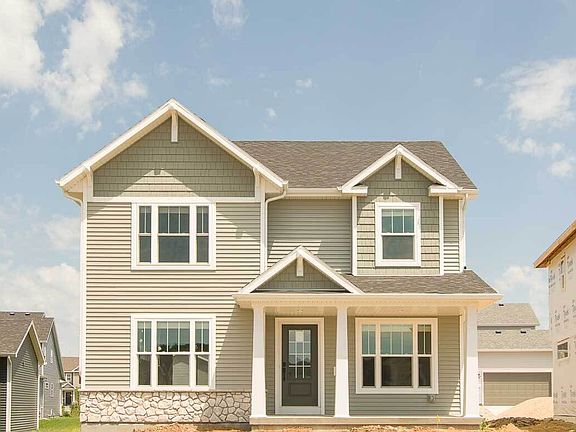Image is representative of home; colors may vary.All prices, promotions and specifications are subject to change at any time without notice based on the discretion of Veridian Homes. Amenities: 12'x14' Patio with picture framing, convenient access from the dining area, Basement features 3/4 bath rough-in for future finished basement, Convenient main floor laundry, Craftsman style 2-story twin home, with 3 bedrooms and 2 1/2 bathrooms, Custom Auburn Ridge(R) cabinetry, doors and trim throughout the home, Exterior features Mastic(R) siding in "Scottish Thistle," Mastic(R) Cedar Discovery Shakes in "Quiet Willow," Halquist(R) stone accents and Pella(R) Encompass Windows in White, Hallman Lindsay(R) "Metro" paint with Orange Peel Texture, Kitchen features large island with a breakfast bar and MSI quartz(R) countertops in "Meridian Gray", Matrexx(R) Carbonado LVT/LVP flooring in "Pebbled Oak" throughout kitchen, dinette, foyer, powder room and great room, Open Concept floor plan, Owner's suite features tray ceiling, walk-in closet, plus owner's bath, Shaker-style kitchen cabinetry in "Silhouette on Maple," includes hardware, crown moulding, soft close drawers/doors, and pull-out trash, Top plumbing brands used throughout the kitchen and bath, such as Kohler, Sterling and Moen, Versatile flex room can serve as a home office, library, or music room