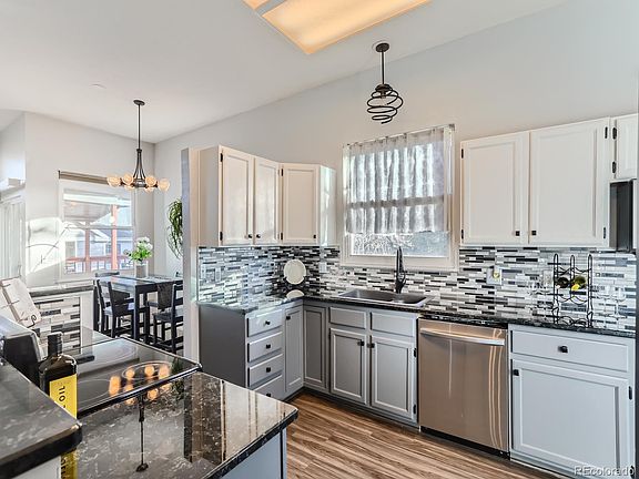 This Littleton Beauty is Renovated and ready for you to move in. Newer, black metal, modern light fixtures complement the open concept living area and accentuates the vaulted ceilings—a perfect entertaining area. The newer, luxury vinyl floors sprawl throughout the main floor including entry, kitchen, slider access and laundry/mud room. Cooking in this kitchen is a homeowners dream with higher end stainless steel appliances, granite and island with seating area. The unique granite is extended past the added cabinetry to allow for additional working space/storage/and a built in microwave. Blue granites are rare in this World - it is a luxury and exotic granite in black tone with some subtle blue speckles and is absolutely gorgeous. There is no shortage of storage in this kitchen with plenty of cabinetry and a conspicuously placed pantry. The two toned, refinished cabinetry is a perfect blend with the new backsplash, Bocci Campino Matte Black Granite sink and faucet. The refrigerator is a GE Café™ Series ENERGY STAR® 27.8 Cu. Ft. French-Door Refrigerator with Keurig® K-Cup® Brewing System in the door. The stove is an electric convection range with dual door opening and bottome drawer warming oven. Microwave is a fingerprint resistant, 2.1 cu ft, wall installed, 1,000 watt and 400cfm warming dream. Main Floor primary bedroom is bright and cheery with decorative ledges near the ceiling and window bench seating area. The 6’x17’ walk-in closet is separated from the bedroom by a subtle pocket door and features an 8’ long double closet rod (16 feet of skirt/shirt/pants hanging) and 5 1/2’ single closet rod (perfect for longer wardrobe items.) The bright and cheery walkout basement features a bonus/rec/office room and huge bedroom with walk-in closet, 3/4 bath and two egress windows.