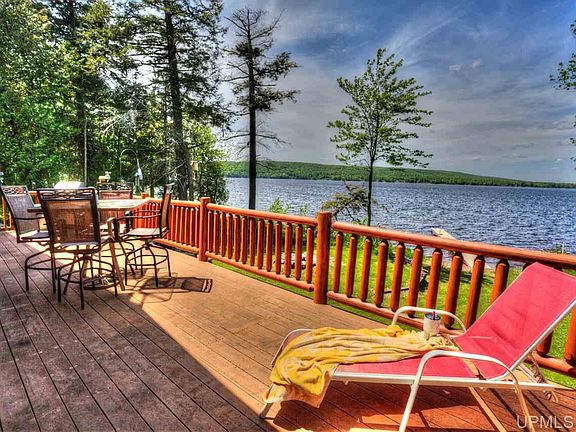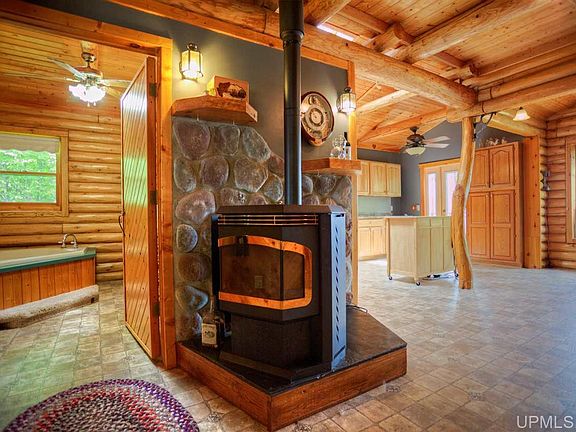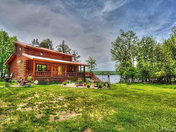 Live the lake life! Beautiful log home has 2+bedrooms, 1 full bath and 2 half baths. Log walls and beams throughout the main and upper floors and custom wood cabinets give a cabin feel. Full walk-out finished basement has a kitchen, utility room, entertainment area and a mud room. Also included are a wrap around deck, plenty of storage, central A/C and generator big enough to power the house during outages. 3.83 acres, 265 ft of lake frontage with a swimming beach means plenty of privacy. Pole barn with a work shop and a 2 stall garage are also on the property. Beautiful sunsets are included.
