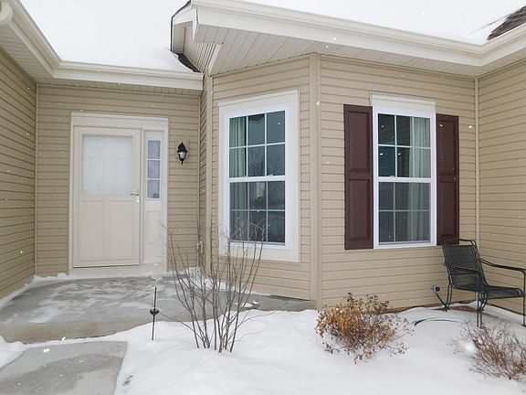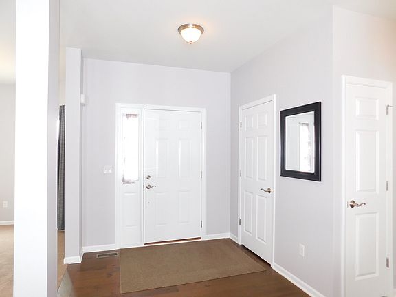 PRISTINE NEWER RANCH HOME WITH BEAUTIFUL INTERIOR COLOR SCHEMES! Kitchen showcases granite tops, maple cabinetry, pullouts, pantry, stainless steel appliances & recessed lighting. Eating area opens onto patio with view of open space & mature trees! Living Room boasts open floor-plan with Roman shades. Formal Dining Room presents chandelier. Hardwood flooring, 9 ft. ceilings, brush nickel light fixtures & white doors & trim-work embrace this lovely ranch home. Popular split bedroom arrangement! Master Suite features 7'x7' walk-in closet, tiled floor, extra wide shower w/ glass door, linen closet. Bedroom #2 presents another walk-in closet. Full hall bath displays ceramic tile flooring. First level laundry room includes washer & dryer. 92+ high efficiency furnace, 50 gallon power vented hot water heater, humidifier & studded & insulated basement. Drywalled & painted garage. Enjoy closeness to elementary school, walking distance to downtown & view of landscaped green space!