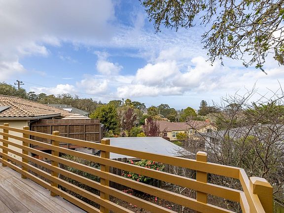 Truly the best of two worlds, this special home offers the ease of a short walk to downtown Monterey and the beauty of a quiet, wooded neighborhood. Located in the Peters Gate area, you enter a thoughtfully landscaped garden and a private patio area for the afternoon sun. Inside, enjoy bay views from the great room or off the balcony. Newer appliances, handsome wood cabinetry, soapstone countertops, custom wood finished windows and oak hardwood floors create a warm inviting atmosphere. Included in the primary level you have two beds and baths, and an office or workout room. Down an easy flight of steps you will find a large third bed or family room that looks onto the private lush backyard, and a half bath