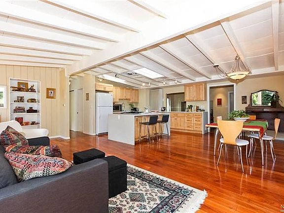 Mid-Century Modern home on FLAT, knoll top, sunny setting w/wrap around yard & Tam view. 2 Master Suites (1 is newer addition upstairs)-all main living on 1 level. Remodeled kitchen. Street to street lot. Kitchen/great room opens to family room. Great indoor/outdoor flow. Just above Homestead Valley.