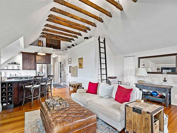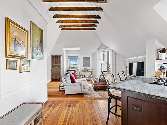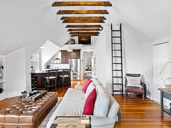 Now's your chance to live in THE penthouse loft of Uptown Hoboken's grandest historic Mansion on Elysian Park and iconic Hudson Street! This 1bed +den functions as a great 2 bed alternative with second bedroom perfect for an office, den, nursery or small guest bed. Stunning views and tons of natural light comes pouring in from your plentiful windows and bonus alcove bay window nook perfect for relaxing. This rarely available and unique home, as seen in 07030 Magazine, offers the charm of the old and the amenities of the new in this one of a kind open floorplan! With stunning exposed beams on 20 foot cathedral ceilings, original period detail and intricate millwork, original pine floors, meets upgraded modern lux kitchen and marble baths for today's discerning homeowner. This bright & sunny kitchen includes Soapstone counters, stainless steel appliances, Verona stove, Sharp microwave, and dishwasher. Huge attic space and ample closets in the living room, master bedroom, utility closet and provide more than enough storage. Also included are the LG washer/dryer, 55" Samsung TV, and 52" Sony TV already mounted. Rounding this home nicely out with a shared backyard, a block from vibrant Washington St or the breathtaking skyline on the waterfront, close to fabulous restaurants, Trader Joes and Kings, ferry to midtown or FiDi, 126 bus to Port Authority.