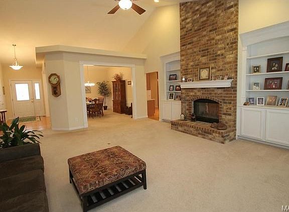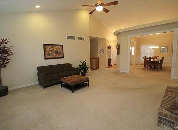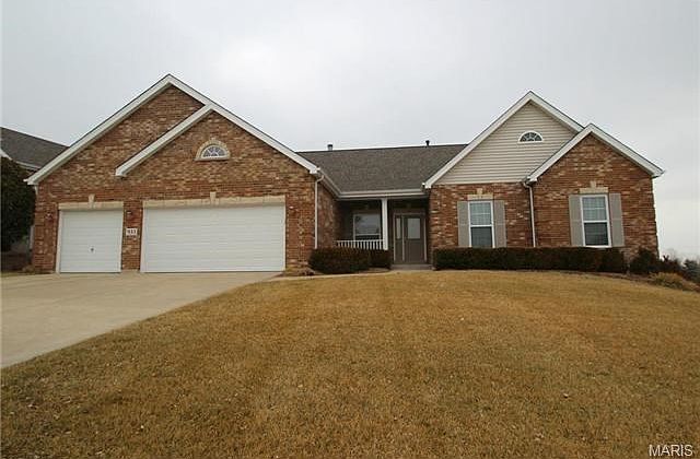 Spacious 3+ bedrm 2.5 bath Vantage built ranch w/ 3 car garage on level lot w/convenient access to Hwy 364 & the Katie biking/walking trail. Home features neutral décor including lighter color carpeting, light hardwd flrs, kitchen & vanity cabinets & lighter color walls waiting for your personal touch. Custom millwork abounds such as bookcases on both sides of see-thru flr to ceiling brick fireplace in great rm, w/ see thru hearth into breakfast room. Fluted woodwork & light wood wainscoting in dining rm, transom windows in great rm, 6 x 13 entry foyer w/ hardwd flr & stained glass entry dr w/sidelight, custom wood 42 cabinets w/crown molding in kitchen along w/ hardwd flrs in kitchen & breakfast rm. Large master w/coffered ceiling, walk in closet & luxury bath w/ separate tub & shower plus adult height double bowl vanity. Hall bath features a double bowl vanity plus tub/shower. L/L is ready for finish w/rough in plumbing for full bath. There is a 12 x 20 concrete patio.