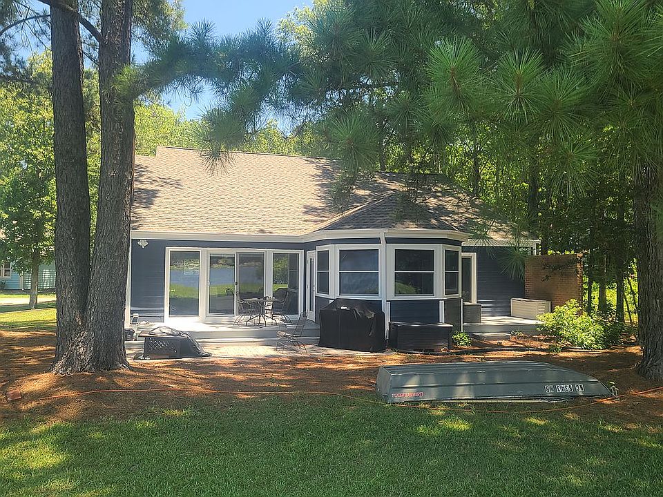LAKEFRONT in Gated Carolina Trace Community. Lots of Space, Two downstairs masters--one with deep soaker tub. Open concept Kitchen/Living/Dining. Great For entertaining. Enjoy sitting on the deck or inside your home overlooking the lake. HVAC, ductwork, roof, and windows new in 2019. Downstairs was remodeled in 2019, along with granite in kitchen and two master bathrooms. New 30x35-foot garage with upstairs that has been roughed in built in 2022. Pool is within walking distance along with the other wonderful amenities.