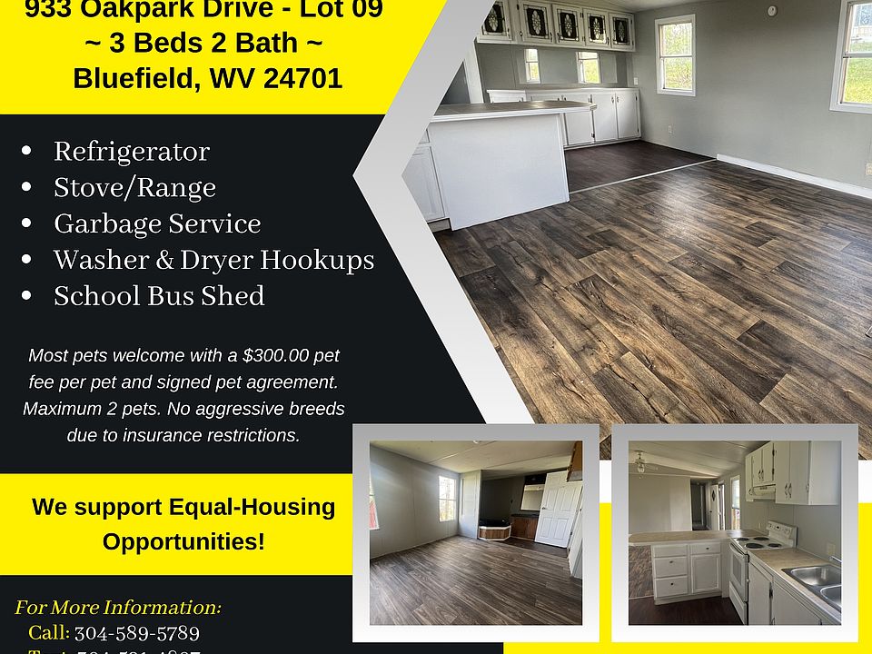 933 Oakpark Drive Lot 09 ~ 3 Beds 2 Bath ~ Bluefield, WV 24701 LEASE OPTION (Path to Home Ownership): Initial payment: $1,500 with no payments due until the 1st of the following month! Monthly payment: $810/month includes lot rent and curbside trash service. No utilities included. or RENTAL: Security Deposit: $810. Can be made in payments if needed. Monthly payment: $810/month includes lot rent and curbside trash service. No utilities included. Sorry, this home is not HUD approved. 3 Bedroom 2 bath mobile home available for rent or lease option located at The Oaks MHP on the hill behind the Brushfork Armory. The mobile home community features a community garden, basketball court, and bus shed, on-site snow removal, 24-hour on-site management, & full-time maintenance staff. Paved roads throughout the community and off-road parking. Quiet family community with large spacious lots, great view, all underground utilities, & monthly gift card drawings. Each resident is responsible for lawn care within their own lot. Christian Management Corporation Office Hours: Mon-Fri 9:00AM-5:00PM & 10:00AM-2:00PM the 1st Saturday of every month You can view THIS property 7 days a week! Most pets welcome with a $300.00 pet fee per pet and signed pet agreement. Maximum 2 pets. No aggressive breeds due to insurance restrictions. Clean, safe, quiet, crime & drug-free are our priorities for our residents! We support Equal-Housing Opportunities! Good people with good, bad, low, or no credit but stable employment or Social Security are welcome. -MUST pass background check -NO evictions in the last 7 years -NO sex offenders Is this property not what you are looking for? View our other available #homes, #mobilehomes, #apartments, and more on our Facebook or our website!