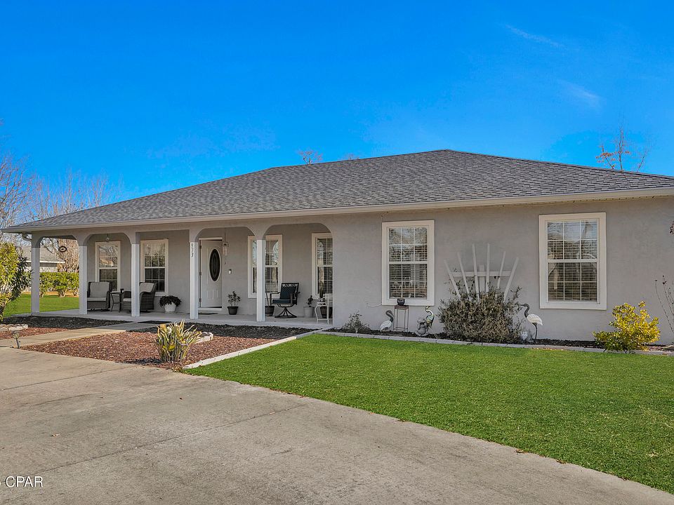 CHARMING HOME ON 1 ACRE CLOSE TO TYNDALL AFB. This spacious 1-acre property is conveniently located just 2.5 miles from Earl Gilbert Park near the Tyndall Bridge and 3.5 miles from Tyndall Air Force Base. Offering nearly 2,000 square feet of living space, this well-maintained home features 3 bedrooms, 2 bathrooms, open concept kitchen dining area and a separate living area with a split floor plan. The private primary suite includes a versatile flex space, ideal for a home office or hobby area, with French doors leading to a paved back patio and a partially fenced backyard—perfect for pets or outdoor activities. Recent updates include a new roof in 2018 and an HVAC system and water heater replaced within the past 2.5 years. Additional features include a large laundry room with exterior access to the side yard, a semi-circular driveway for easy parking, and three storage sheds for tools, equipment, or hobbies. All information is deemed reliable but not guaranteed; buyer to verify if important.
