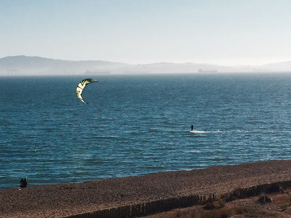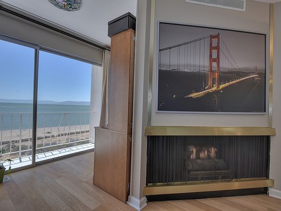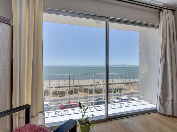 RARE top floor unit. Unobstructed VIEWS of San Francisco Bay. Engineered hard wood floors, tile floors, new vanities in bathrooms. Sub Zero fridge, quartz counters, tile back splash in kitchen. Master suite. One car garage. Security gate. Fabulous South Shore location across from beach. Near shops.
