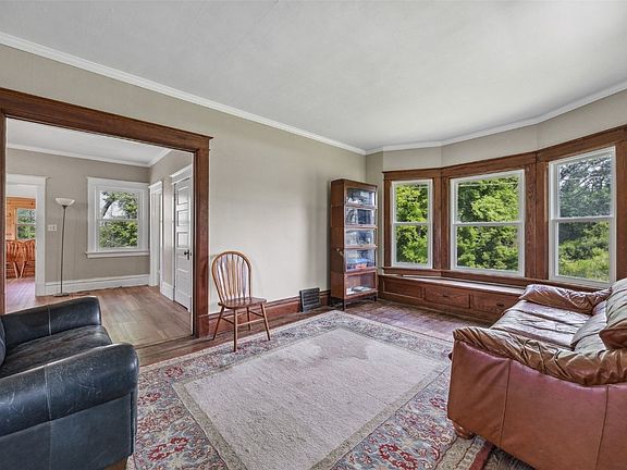 Discover the perfect blend of charm and space with this rare in-town acreage just off a main service road. The property features a beautiful mix of mature trees and open field, offering both privacy and room to roam. The farmhouse-style home is full of old-world character with some updates already in place—ready for you to make it your own. A detached 3-stall garage is in excellent condition and ideal for vehicles or hobbies. You'll also find a large pole barn providing extra storage or workshop space. This unique property offers a peaceful, country-like feel with the convenience of in-town living.