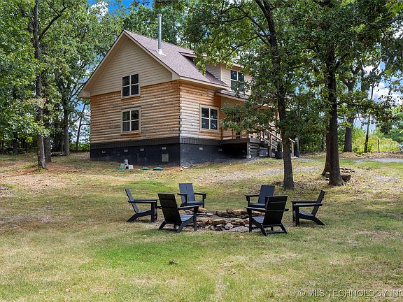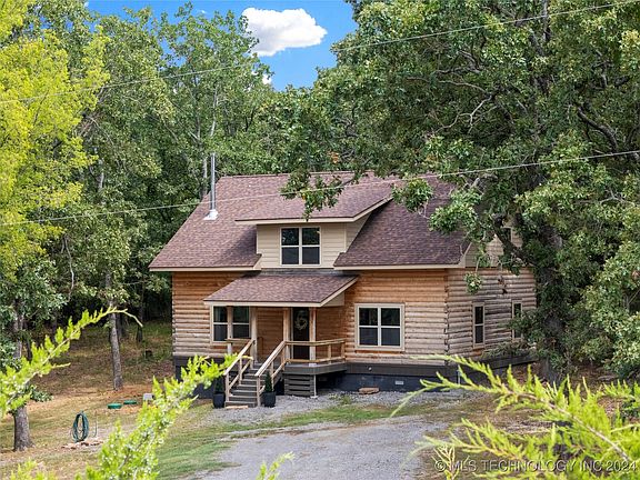 Escape city life to this Modern Log Cabin on 10 acres, both a homesteader’s dream and sportsman’s paradise surrounded by public hunting land, off-roading & hiking trails, Greenleaf State Park & Lake, Tenkiller, & Ft Gibson Lake. Thoughtfully designed for sustainable off-grid living, the cabin features Pre-Cut Logs & Spray Foam Insulation to ensure energy efficiency as well as a Wood-Burning Stove with Cooktop feature. Unwind after a day of adventure around the Fire Pit or in the Primary En Suite Soaking Tub on the main level. The interior offers an open floor plan with Tall, Vaulted Ceilings as well as walk-in Pantry, Indoor Laundry, Office/4th Bedroom, Storage, and a Flex Room upstairs. All-weather Outdoor Decking in the front & back covered entries. Additional +/-2,400sf Block Building w/utilities stands ready for your customization. The diverse landscape includes a mix of Open Pasture and Lush Woods, a Wet Weather Creek, and countless Pecan Trees & Berries. Three Utility Poles enable easy addition of Pad Sites making it ideal for multi-generational living. With ample space to tailor the property to your vision, build a legacy to create a tradition of shared experiences, cherished moments, & lasting memories! Less than an hour from Tulsa and 20 minutes from medical, dining, & shopping in Muskogee.