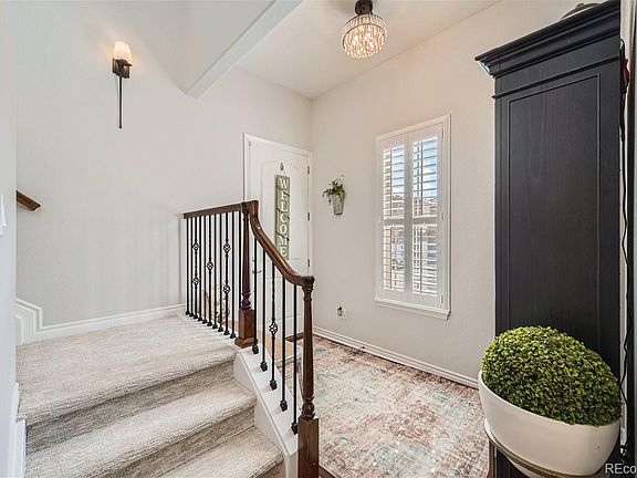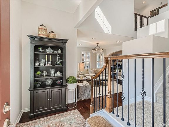 Elegant 4 bedroom, 3 bath luxury townhome in Tresana loaded with Upgrades!. Experience upscale low maintenance living in Highlands Ranch with quick access to C-470, shopping, restaurants, trails, community pool and all HRC Rec Centers. This popular Bozzetto Model offers an open concept living and panoramic mountain view from the patio off the living area. Living room is light and bright, stacked stone gas fireplace, you notice the custom lighting and plantation shutters throughout. The gourmet kitchen is complimented by the pendent lighting, huge granite slab, gorgeous cabinets, new SS cooktop, newer SS microwave, double ovens, bosch dishwasher, updated large blanco sink, and new SS refrigerator. Entertaining is a breeze with the dining area off the patio. The patio has teak patio floor with puppy area and drainage system. Included on the main floor is 4th bedroom (currently playroom) with adjacent guest bath with shower updated toilet & facet. Upstairs you will find the primary suite with private balcony, engineer wood flooring, and a completely renovated primary bathroom. Additionally on the upper level you will find the convenient laundry room, 2nd & 3rd bedrooms with Elfa closet systems and bathroom 3 with dual vanities. *High end Frigidaire Furnace and AC (June 2020) *APCO Fresh Air System *Water Treatment System *Insulated Attic & Garage * Finished Epoxy Floor/Ample Storage Space/Upper *UV Film & Solar Blocking Screens on some windows