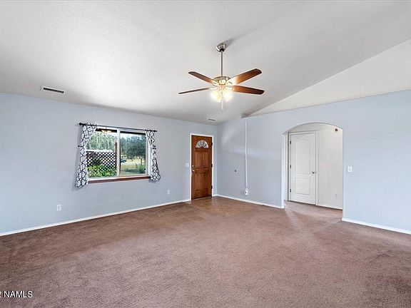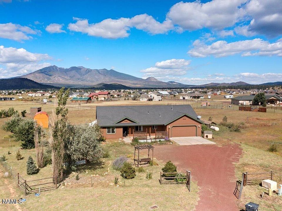 Ready to enjoy the beauty of country living? This gorgeous home sits on 2.5 acres with unobstructed views of the San Francisco Peaks. Enjoy hiking trails in the national forests only steps from your front door. The home has an attractive split floor plan with vaulted ceilings and a pass through fireplace from the living to dining area. Large kitchen with outrageous views. Owners Suite has large walk in closet and en suite bathroom with jetted bathtub. Home has plenty of storage closets! Previous owner created numerous gardens, raised garden beds and planted a small orchard. Horses and Livestock allowed, and there are two fully fenced pastures. No HOA. 8x16 storage shed. You will not find this kind of paradise at a better price.
