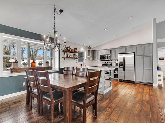 Wow, this meticulously updated rambler on 27 acres could be the perfect home to your new hobby farm! It recently received a new roof, siding, overhead door, and upper level windows, and has been thoughtfully refreshed inside with a beautiful kitchen, newer flooring, ship lap fireplace surround (1 of 4 fireplaces!) and remodeled master bath with freestanding soaking tub and tile shower. The primary suite is split to one side of the home with main floor laundry nearby, and two additional main floor bedrooms on the other end. Enjoy the large deck overlooking the wooded backdrop with the Elk River behind it, where you will never see another home. There is another bedroom and den downstairs and the ultimate bar in the walkout basement. The home has a heated double garage, and the 56x28 ft shop has full concrete floor, with 24x28 ft being epoxied, heated, and cooled. The animals are in a 40x40 building and there are other outbuildings and gazebo next to the pond with extensive landscaping.
