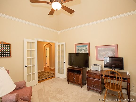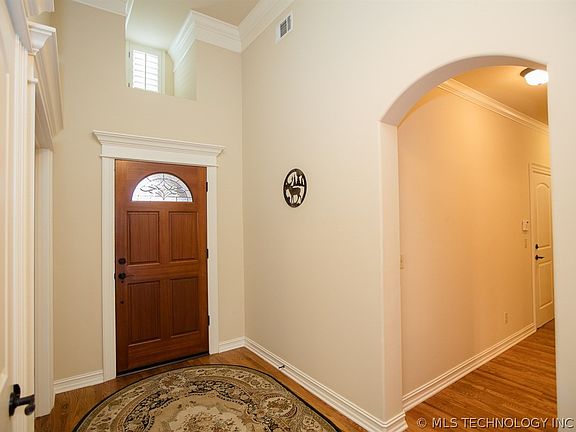 Beautiful 1 story gated Villa in So. Tulsa. 3 car garage. Small, private yard. Sprinkler. Amazing custom trim & details. Split bdrm plan w/2.5 baths. Granite & stainless kitchen open plan. Lux bath. Neutral colors, plantation shutters. Stairway to attic.