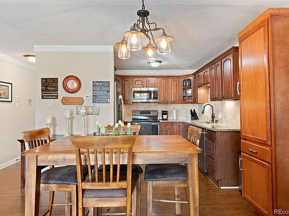 1st floor corner unit with a pretty courtyard view. Updated kitchen features cherry stained cabinetry with granite countertops, tile backsplash and stainless-steel appliances. There are vinyl laminate floors in the kitchen and living room. You’ll love the feel of the great room. The living room is expansive and an enclosed lanai gives you extra space for an office or additional sitting area. Both bathrooms have been nicely updated with tall vanities, granite countertops, tile surrounds in the shower/tub area and newer lighting. The large primary bedroom features a walk-in closet and laminate flooring. The second bedroom is just off the living room and could be used as a second sitting area or office. A large storage room with cabinets and shelves provide additional space for all your extra things. The enclosed lanai has tile floors, Low-E glass slider door and an exterior door that allows you to conveniently enter the courtyard. From your lanai you’ll enjoy the fall colors and the lush gardens & flowers coming to life in Spring. Newer windows and storm door in the lanai. Monthly HOA dues include property taxes. Lots of visitor parking and there are many RTD bus stops located throughout the community. Additional storage closet on 4th floor plus another storage cabinet in the parking space. Come experience Windsor Gardens!
