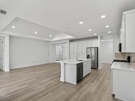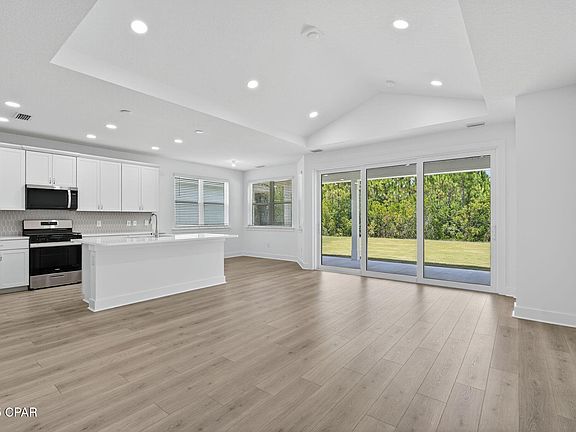Easy Living Meets Elegant Design in the Parrot Floorplan! This beautifully upgraded new construction home in Latitude Margaritaville Watersound is ready to welcome you home immediately! The Parrot offers a bright, open layout with thoughtful touches throughout—perfect for those looking to enjoy the good life in a vibrant 55+ community. Step inside to find 8' doors, recessed lighting, and a stylish mix of laminate and tile flooring. The kitchen shines with quartz countertops, a tile backsplash, upgraded cabinetry, and a stainless steel refrigerator already included. The laundry room cabinets add convenience and extra storage.
