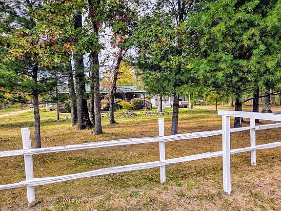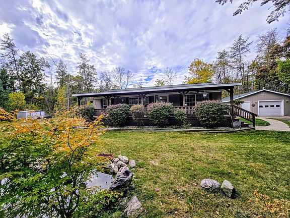 Perfect Baldwin home on 5 beautiful acres for seclusion. Large front porch facing wonderful water feature/pond with waterfall and State Land across the road for hunting. Good detached garage with it's own electric panel for car plus tool work shop. Additional separate structure for housing guest with nicely fenced high dog run and garden space, has a high fence to keep the NUMEROUS deer from eating your vegetables! Land has good trails started for ATV family fun! Don't wait another year, Come and enjoy your Northern dream home! Paved road with Good plowing - next road south is W76th great connecting road to M37 Big Star Geo (can get anywhere fast) . Pellet stove to keep real cozy in living room. Plus of course year round furnace. sq ft & manufactured vs modular is not yet known