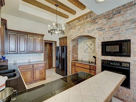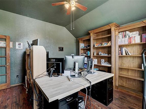 This well cared for home has so much to offer! Beautiful brick and ceiling detail in the kitchen, and it has a brand new dishwasher! Four spacious bedrooms plus a study behind French doors with large built-in book shelves. Great ceiling details, bonus junior office/storage area. Just tons of space and storage with a well thought out floor plan. No neighbors behind gives you a beautiful Oklahoma view! Storm shelter in garage floor. This home has fresh exterior paint and a new storm door.