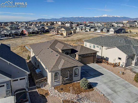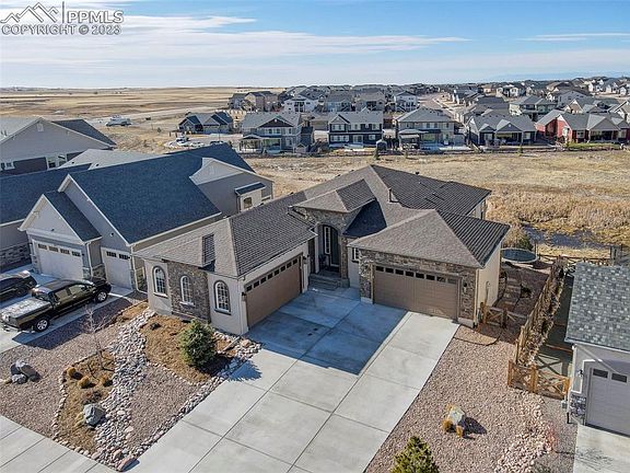 Stunning Ranch home in Banning Lewis Ranch!! This home features 5 bedrooms, 5 bathrooms, a 4 car garage, a walkout basement, spectacular views, and backs to open space. The main level features the great room with open concept kitchen, living room and dining. Walkout to the deck and enjoy breathtaking views of Pikes Peak! The main level also features the master bedroom with connected 5-piece bathroom. A second ensuite is also located on the main level. The finished walkout basement includes yet another ensuite, small play room under the stairs, two more bedrooms, and walkout access to the amazing back yard. This property is minutes away from schools, located in the Banning Lewis Ranch community with amenities galore, including neighborhood schools, over 75 acres of parks/trails/open space, tennis courts, basketball court, rock climbing parks, zip-lines, access to pools, splash pad, water park, and dog park. Recreation center houses a fitness center and also regularly hosts classes and events for all ages. In the summer months, catch a neighborhood concert, festival, food trucks, farmers market or enjoy other regular community events. This community has it all.