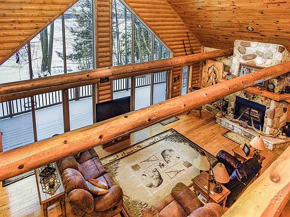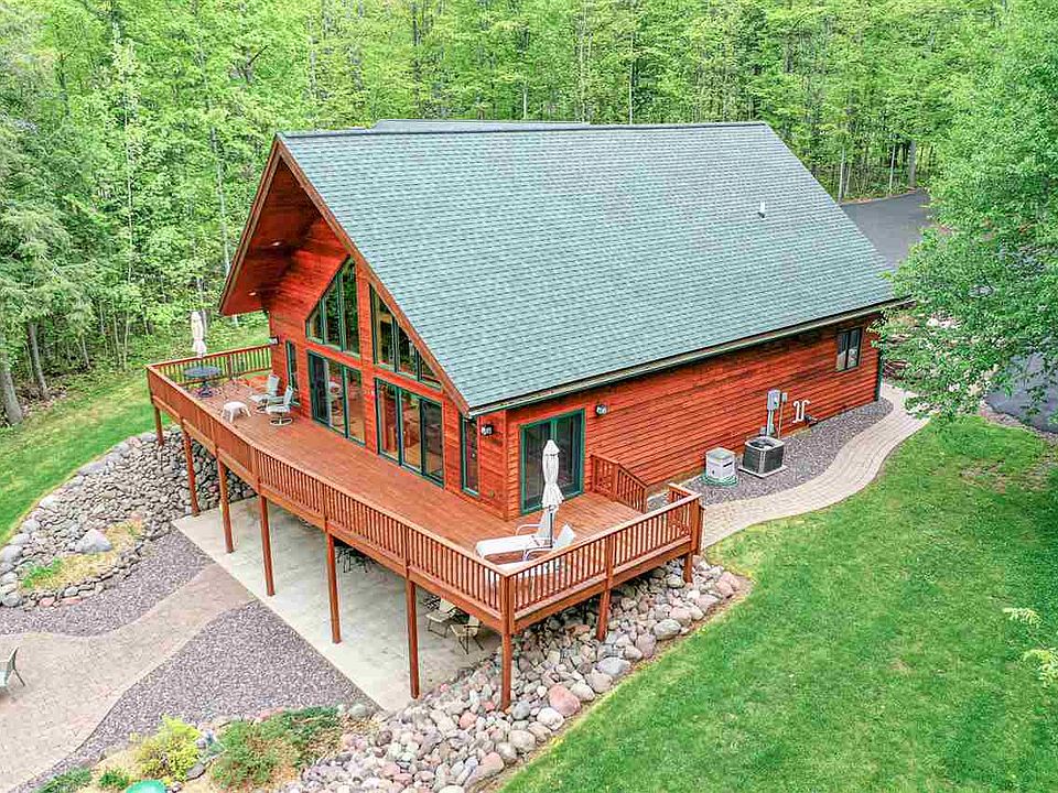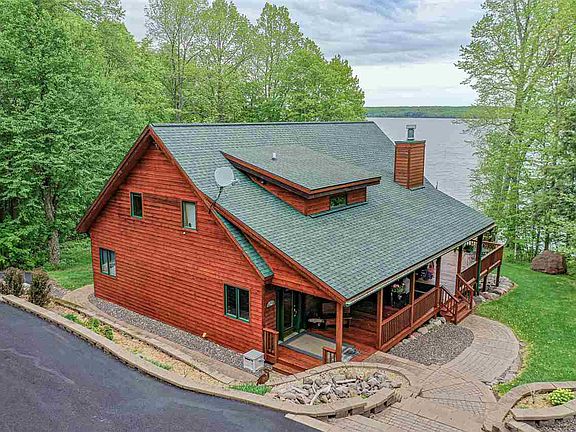 PRICE CHANGE!! Premium 4BR/3BA West Shore Lake Gogebic executive home w/220' of prime frontage! Enter to find a massive great room w/towering cathedral ceiling, open kitchen/dining area, impressive field stone fireplace, huge log beams, large bedroom, full bath, laundry room, & commanding view of the lake through a wall of trapezoid windows. Go up the log staircase to find a loft suite w/master bedroom, en suite full bath + garden tub, abundant closet space, & mezzanine overlooking the great room. Downstairs is the charmingly finished walkout basement, there's an incredible family room w/ masterfully crafted wet bar, 2 large bedrooms (one with a walk out to the lakeside patio), storage rooms, & a full bath. Enjoy the lake's magnificence from the huge wraparound deck or lakeside patio w/fire pit or the included boat house, dock & boat lift. A blacktopped driveway w/extra parking is framed by beautiful landscaping while the 4-car detached garage offers plenty of storage for vehicles & toys.