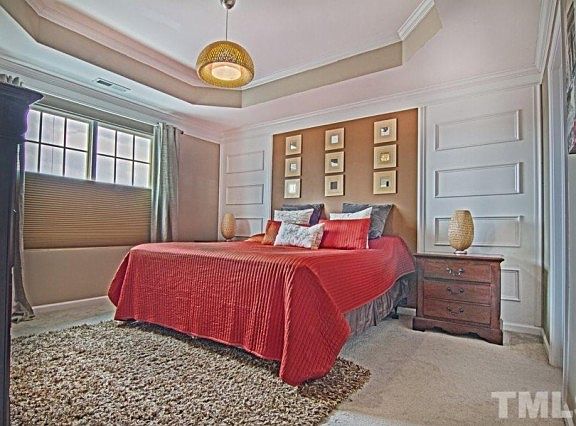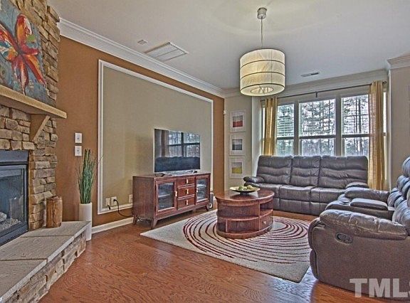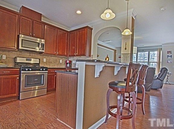 Gorgeous & popular Baxter floorplan loaded with upgrades is here!! 1st Floor BR w/full bath! Wrought iron stair balusters, 9' ceilings, beautiful hardwoods, extensive crown moulding & wainscoting throughout, cer. tile back splash & shower, granite counters & SS appliances, 2 balconies, trey ceiling, & floor-to-ceiling stone FP in fam room. 2 car gar. for added privacy & storage. Enjoy clubhouse, fitness center & pool! Convenient to I40, 540, RTP & RDU. Walk to Brier Creek restaurants & shopping. Come see!