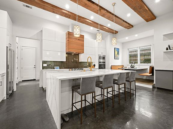 Ample storageGourmet kitchenHome officeBeamed cypress ceilingsCovered patioQuartz countertopsSpacious downstairs primary suite
