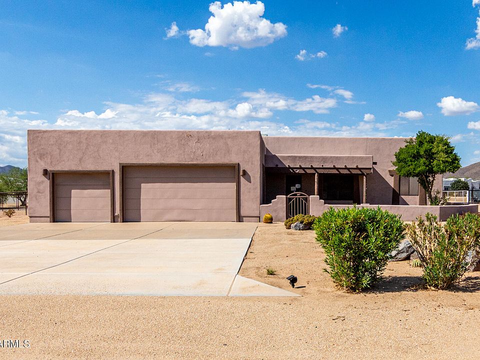 Welcome to New River Paradise, a sought-after community with no HOA! This spacious home sits on a large horse-friendly lot and offers a desirable split floor plan with a bright, open great room. Natural light pours in through three skylights, highlighting wood flooring, granite countertops, and stainless steel appliances. Two sets of French doors open to a full-length covered patio where you can take in sweeping mountain views. The extended three-car garage provides custom cabinetry and storage, while two RV gates, a circular driveway, and an RV area with full hookups make access and guest accommodations easy. Fully fenced for privacy and just minutes from 12th Street Ranch and Equistar School of Riding, this property blends comfort, convenience, and room to roam.