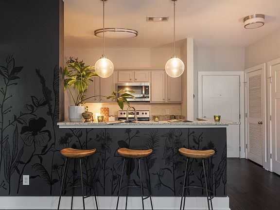 The kitchen is a true highlight, with sleek finishes, stainless steel appliances, and a muted custom botanical mural that adds just the right touch of personality. The open-concept living area flows seamlessly to a private balcony overlooking nature views and trees, perfect for your morning coffee or an evening wind-down.