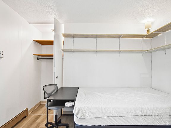 Smart tvStately brick buildingMany storage spacesCozy placeComfortable memory foam bedDining tableLuxury flooring