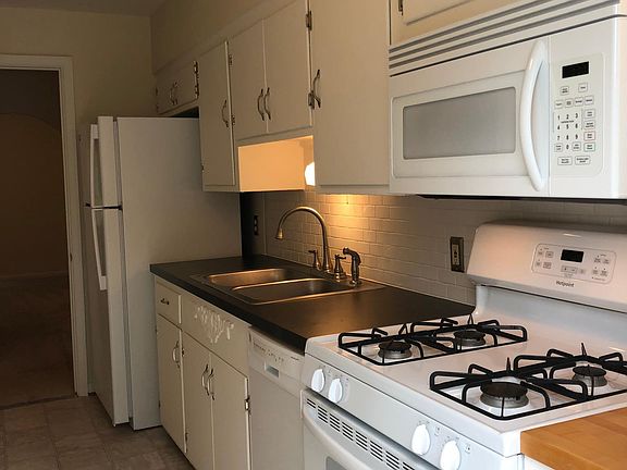 Two bedroom flat with 1 car detached garage (with remote opener), locked common hall and basement. Basement has washer/dryer and private storage bin. Unit has security system (monitored at resident's expense) carpet, central air conditioning, blinds, decorative fireplace in the living room and updated bathroom with oak vanity/mirror and vinyl. Kitchen updated with tile backsplash, new counter tops, refinished cabinets, refrigerator, stove, dishwasher, and microwave range hood. Resident pays gas, electric and water (Guardian) -No pets please