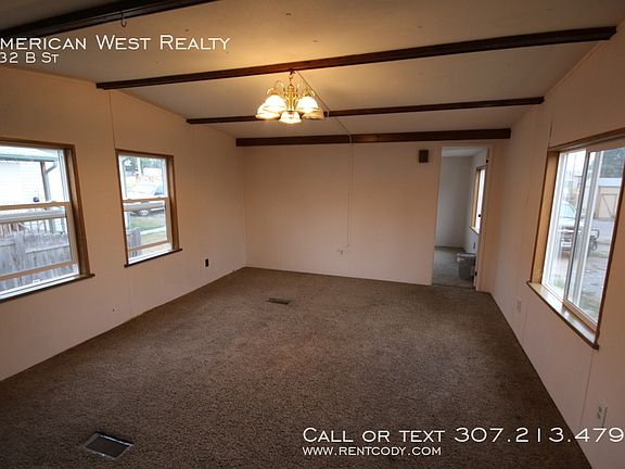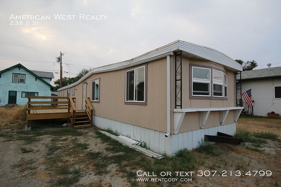 SCHEDULE A SHOWING ONLINE AT: showmojo.com/lh/764365406f Manufactured home on a private lot with plenty of parking space. New windows, siding, roof, and front deck. Newer flooring in some rooms. Small deck in back. Large bedroom on one end has direct access to bathroom. Second bedroom is on the other side of the bathroom. Third bedroom on other end of the house has a private half bath (toilet, sink). Open kitchen and living room. Forced air heat, city water. Pet negotiable. Cable Ready Deck / Porch Fencing Partially Fenced Heat Forced Air Kitchen Dishwasher Kitchen Refrigerator Kitchen Stove / Oven Parking Rv Or Trailer Utility Black Hills Energy Utility City Of Cody (Water, Electric, Sewer, Trash) Washer/Dryer In Unit