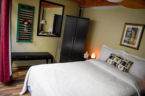 This furnished listing is managed by Corporate Housing by Owner, CHBO. Reference ID: 24332 when inquiring about the CHBO listing. Minimum Stay Required: Nightly. The Skylight Loft is a spectacular fully equipped place to stay -- a 950 square feet loft style condo in the historic Manitou Spa building with a private balcony. It features an upper loft under a huge skylight, the private balcony has a great view overlooking the mountains and arcade, and there are two common terraces overlooking Manitou. The furniture is warm contemporary, and a granite and glass fireplace completes the cozy atmosphere. The upper loft under the skylight has a double bed and the lower bedroom has a queen bed. The condo is able to sleep 5 and has private Fitness Gym on first floor. Shops and restaurants line the streets, and when you step out of the building's elevator, you are in the center of Manitou with a creek running under an old stone bridge. Parking is convenient in the attached, enclosed garage. Lots to do right outside the front door of the old Manitou Spa building! Manitou is the perfect spot to base your trip from and explore the entire Pikes Peak and mountain area. *2021 Expedia Travelers Rank Manitou Springs as one of the top 20 friendliest cities in the US* The cost will be: $200 per night, (Minimum 2 night stay), a $1000 weekly, or $3000 monthly. There is a $100 cleaning fee, and a $1000 security/damage deposit which is refunded minus the cost to repair/replace anything damaged or broken beyond normal wear.