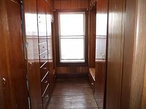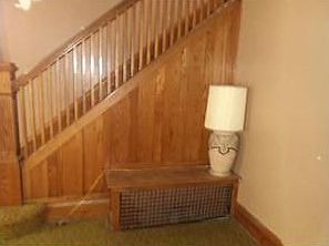 Mission style wood trim, railing, banister. Some hardwood flooring visible. Kitchen looks like Downing. Some deferred maintenance.