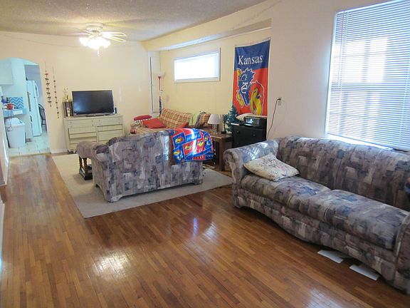 This apartment is in a 2 floor, 3 bedroom Bungalow (Circa 1930s). There is a basement apartment in this house. A "Bungalow," typically, has a front porch, a 1st floor, and a 2nd floor living space that runs the full length of the house and is built into the slopping roof line. This bungalow has the front porch, and on the 1st floor there are 2 bedrooms, a bathroom, a kitchen, and a large living room. From the 1st floor there is a stairway to a 2nd floor, bedroom suite that takes up the whole 2nd floor. (See pictures.) After you Enter the main entry door, off what will be your private front porch, you will be standing in a large living room. (See pictures) --Off the living room, is a short hall that gives you access to the 2 downstairs bedrooms, the bathroom, and a staircase that leads to the 2nd floor bedroom suite. (See pictures.) At the far end of the living room, is the entrance to an eat-in kitchen. From this kitchen is a door that gives you access to stairs that go down to a common laundry room (full size Wash and Dryer). Laundry room is shared by tenants in basement apartment (nice people). --Also off the eat-in kitchen is a door that leads outside to the off street parking area (handy for carrying groceries). Except for the bathroom and eat-in kitchen, the 1st floor has original wood floors throughout. Ceiling fan with light fixture in living room. Three off street parking spaces assigned to this apartment (basement apartment gets the carport). Central Heating and Air conditioning. Walk to Campus and downtown (Check google maps.) Private front porch with a swing. The bathroom has a tub shower combination, a small built in linen closet, and a built in vanity. A pizza place, a BBQ place, 2 restaurants, a convenience store/gas station, and an --adult beverage store --less than a block away. Spayed/neutered cats and small dogs are welcome with pet rent and a pet deposit. Rent is $2400 and you pay Utilities for a 12 month lease starting August 1. References and Security Deposits are required. Please Note: The pictures shown were taken over several years time. The house, licensed by the City, is locally owned and managed by the Schneider family (serving Lawrence Tenants for 37+ years). Shown Monday through Friday 10:00 to 7:00 Nonsmoking units Application fee is $60, upon approval $40 goes towards your deposit! 12 Month Rental Agreement, Security Deposit equal to 1 month's rent, $100 Utility Deposit, pet deposit equal to half a month's rent. 2-3 pets maximum. Cat's are $20 a month per cat dogs are $35 a month per dog. Dogs must be under 40 pounds and must be crated when tenant is not home or we are there for maintenance or showings. Utilities are not included in rent. Tenant has electric in their name and pays gas and water through the property management.
