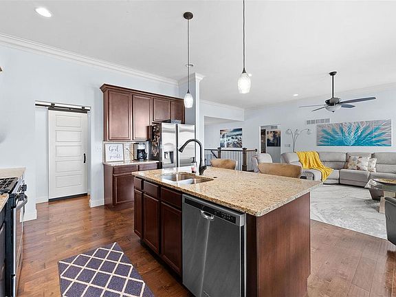 Showings Start 3/5.Open Saturday 3/8 12pm-2pm. Impeccable 3 bed, 2 bath ranch in sought-after Stone Ridge Canyon, featuring 10-ft. ceilings and an open, airy floor plan.This home is better than new with high-end upgrades throughout, including custom paint, upgraded light fixtures, a fireplace, crown molding in the great room, elegant 5-panel doors, and a finished 3-car garage with epoxied flooring.Chefs kitchen boasts upgraded cabinetry with crown molding, stainless steel appliances, a tile backsplash, granite countertops, and a custom walk-in pantry with barn door. Wood floors flow seamlessly through main living areas, complemented by custom blinds for added privacy and style.The primary suite impresses w/ coffered ceilings, a walk-in closet, a separate tub and shower, and upgraded faucets, while the additional bedrooms are spacious with ample closet space. Enjoy outdoor entertaining on the deck with wrought iron fencing.The w/o lower level is huge and ready for your finishing touches