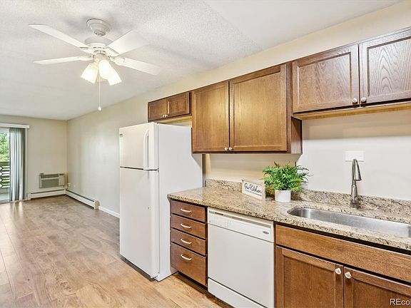 Great location with golf course views! This is a two bedroom, one bathroom, one car detached garage, 945 sf condo in Windsor Gardens. Kitchen has been remodeled with dark brown stained cabinets, granite slab counters, and updated fixtures. All appliances are included. Bathroom tub with optional step in feature, and tile floor. Wood laminate thru-out kitchen, living room, hallways, and both bedrooms. 1 updated wall a/c unit in living room. Screened in lanai, and already installed is the required double pane vinyl slider door! Bonus storage room on same floor. Centralized laundry room for building on 2nd floor. Views into golf course and beautiful surrounding trees. Building not far to nearby clubhouse. Parking garage space is close to the building on end of row, and includes a garage door opener.**Windsor Gardens is Colorado's Largest Age 55+ Active Adult Living Condo Community. Did you know? Monthly HOA Dues include annual property taxes! And heat, water, sewer, trash, round-the-clock patrolling community responders, full time onsite association management, grounds/building maintenance, and activities department. Enjoy clubhouse amenities such as fitness center, indoor/outdoor pools, hot tub, sauna, billiards, library, craft rooms for ceramics, sewing, woodworking, and 9 hole par 3 golf course and onsite restaurant both open to the public. Stay engaged with a wide array of activities, clubs, and events scheduled every month. Additional features include garden plot program, private walking trail and nature preserve, and RV/Boat storage. The Highline Canal runs full length along south side of the complex. RTD Bus Stops located thru-out the community. FHA/VA approved. Close to restaurants, stores, shopping…Minutes to Lowry, Hwy 225, Cherry Creek…Easy access to DIA and downtown. Come see for yourself what Windsor Gardens has to offer.©2021**