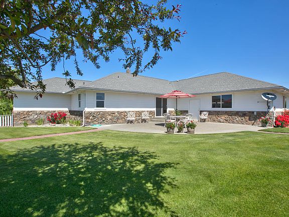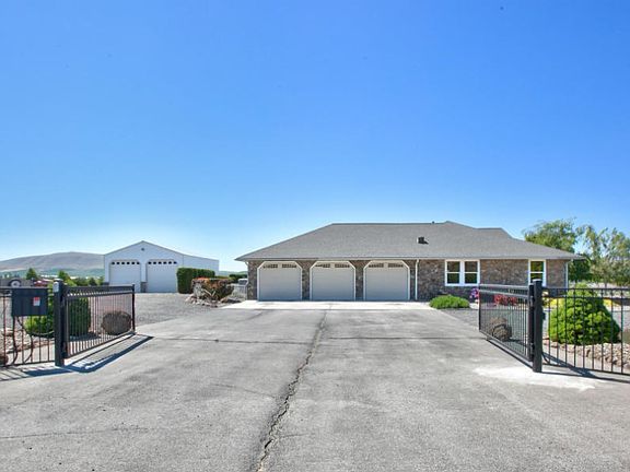 One level home with sweeping view of valley on 2 separate parcels totalling 6.82 acres. 3 bedrooms with office that could be a 4th bedroom. Large master suite with recently remodeled bathroom. Bubble tub, granite & double sinks. Walk in closet and separate closet. Office (or 4th BR) has sliders to patio. Other two bedrooms are large and on opposite end of home. Open concept living room with propane fireplace and kitchen which has also been updated with granite and gas cook top. Attached 3 car garage and separate large shop with 2 RV doors. Gated driveway. More...