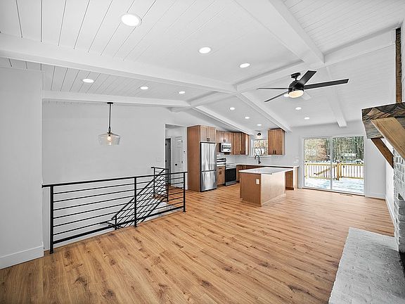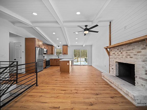 The kitchen features modern cabinetry, gorgeous quartz countertops, and brand-new stainless steel appliances, flowing seamlessly into the main living space, perfect for everyday living or entertaining. A cozy fireplace adds warmth and character, while large windows provide the home with natural light and overlook a brand-new deck, offering views of the surrounding property.