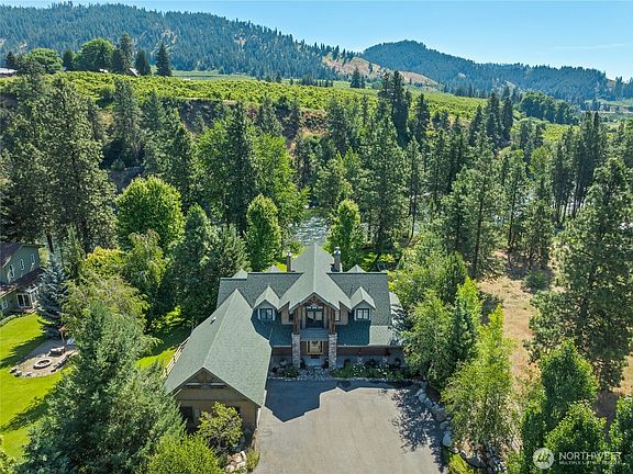 Situated along the serene Wenatchee River, this exceptional retreat offers timeless elegance and natural beauty. Soaring 28' vaulted beams and a stunning floor-to-ceiling rock fireplace anchor the great room, accompanied by a dramatic wall of windows that invite in breathtaking river views. The custom gourmet kitchen is a chef’s dream, while the loft den provides a peaceful perch overlooking the water. Outdoors, enjoy a rare peony garden, organic grapes, blueberries, and raised beds for herbs and tomatoes. Gather around the stunning outside stone and basalt fireplace or the riverside firepit, perfect for entertaining. 2 full-service RV pads. 1040' garage for your projects. A true sanctuary where refined living meets riverfront charm.