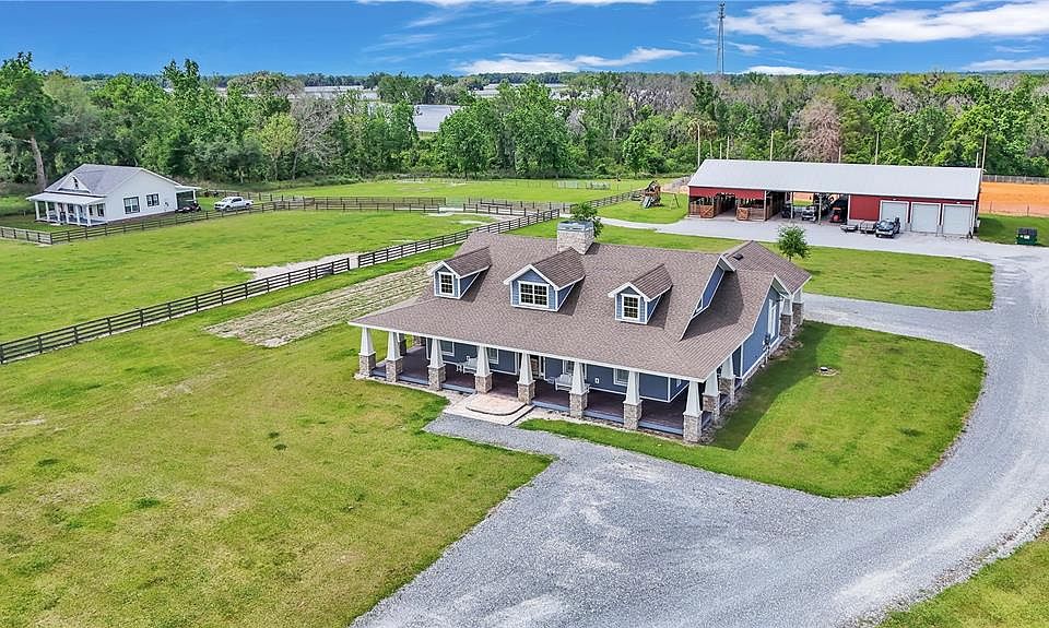 Welcome to luxury living at its finest! Situated on almost 15 acres of pristine land, this exquisite estate at 9344 Chicora Rd in Mulberry, FL, offers a perfect blend of elegance, functionality, and serenity. The entire property includes two homes, a 6000sf barn, storage buildings/tack rooms, dog kennels with water, a 150ftx250ft roping arena, kids playground, RV parking with all hookups, and a workshop. There is an extra parcel of 13 acres that is next to the property that can be purchased separately. It is currently used for hunting land but can be developed and have 2 homes built on the property. Stepping into the main home there is an expansive 3327 square feet of living space, meticulously designed and built in 2018, offering modern amenities and living and entertaining functionality. There is no detail missed from the pot filler in the kitchen, to the beautiful crown molding through the home to the plantation shutters on the windows throughout the home. The main house boasts three spacious bedrooms, each with its own full bath, complemented by an additional two half baths downstairs for added convenience. There is a large office, inside utility and mud room, and a two-sided fireplace that is situated between the dining space and the living room. The primary bedroom is downstairs and has a massive bathroom with his and her walk in closets, a double headed large shower, and divided his and her sinks. Headed upstairs, you can chose which side of the dual staircase to use to enter the upstairs common living space which provides an extra area of entertainment. Each of the 2 bedrooms upstairs have their own in suite bathrooms. Main home is prewired for a whole home generator (generator isn't installed or included). There are 4 septic systems on the property, propane gas and the well is complete with a water softener system. Adjacent to the main house is a charming guest house, featuring one bedroom and one bath spread across over 1100 square feet. Perfect for accommodating guests or as a private retreat, the guest house exudes comfort and style. This home also includes several upgrades and a large screened in back porch and a beautiful front porch as well. One of the standout features of this property is the impressive 6000 square foot barn, designed to meet the needs of both hobbyists and professionals alike. Discover a 2400 square foot workshop complete with a lofted storage space and three roll-up doors, ideal for pursuing creative endeavors or indulging in hobbies. The barn also includes a dedicated horse stall area with six stalls, a convenient wash rack, and a spacious tack room, catering to equestrian enthusiasts. Outdoor enthusiasts will delight in the expansive outdoor storage area, suitable for storing vehicles, campers, boats, and more. A clay roping arena adds a touch of excitement and entertainment, providing the perfect venue for equestrian activities and gatherings. This property is only minutes from Streamsong and nice restaurants. New Publix coming soon within 15 minutes from the home. Other parcel is up for sale for an additional 200k (which seller is willing to finance with purchase of the main property.) All info and sizes are believed to be accurate but should be verified by buyer and or buyers agent.