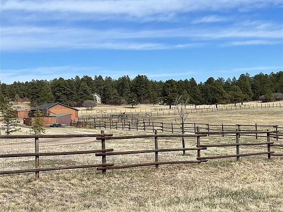 Welcome to this spectacular 4 bedroom, 3 bathroom home in the highly sought-after Comanche Pines Subdivision in Franktown, CO with 3 outbuildings including a loafing shed, 4 stall covered barn and huge workshop! This spectacular 4,100+ sq. ft. home is nestled on over 8 fenced acres and offers seclusion and privacy yet is just minutes from town! As you enter the home, you will immediately notice the wood accent walls, hardwood floors and sunken living room with large picture window and a cozy wood-burning stove-perfect for those cold, winter nights! Entertaining family and friends is a breeze in the large dining area and recently upgraded kitchen complete with all new stainless steel appliances, 5 burner gas stove, copper farmhouse sink and gleaming butcher block countertops! Head outside to your wrap around deck which is perfect for lounging or al-fresco dining! Completing the main floor is a large office with vaulted ceilings and an oversized bay window with tons of natural light and 1/2 bath. Fido and friends will love playing in the fenced dog run just off the kitchen area. Upstairs you find a spacious master suite with soaring ceilings, exposed wooden beams, 4 closets with tons of storage, a 5 piece bath, and incredible views of Pikes Peak! Completing the upper level is a spectacular secondary bedroom suite with a separate living/sitting area that walks out to your private balcony with gorgeous views as well. Walk down the hall to two other bedrooms and a full bathroom complete with barn door, quartz countertops and tub. The breath-taking landscape is fenced & cross-fenced for horses or livestock and the barn has 4 stalls, hay storage, a tack/equipment room with water/electricity, a loafing shed, and 3 stall outdoor barn and large workshop as well. You will be hard-pressed to find a home with this much square footage on over 8 acres of land for this price! Don't miss this incredible value!! Hurry and book your showing today! This one will go QUICK!!